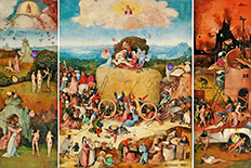 Das Gemälde "Der Heuwagen" ist ein Triptychon des niederländischen Malers Hieronymus Bosch, das um 1490 gemalt wurde – natürlich ohne unsere Ostereier.
